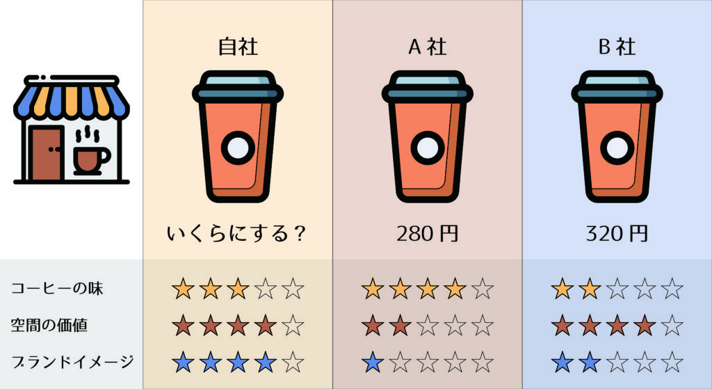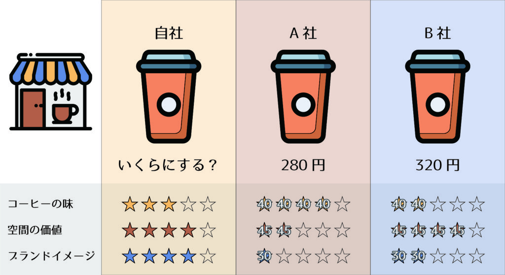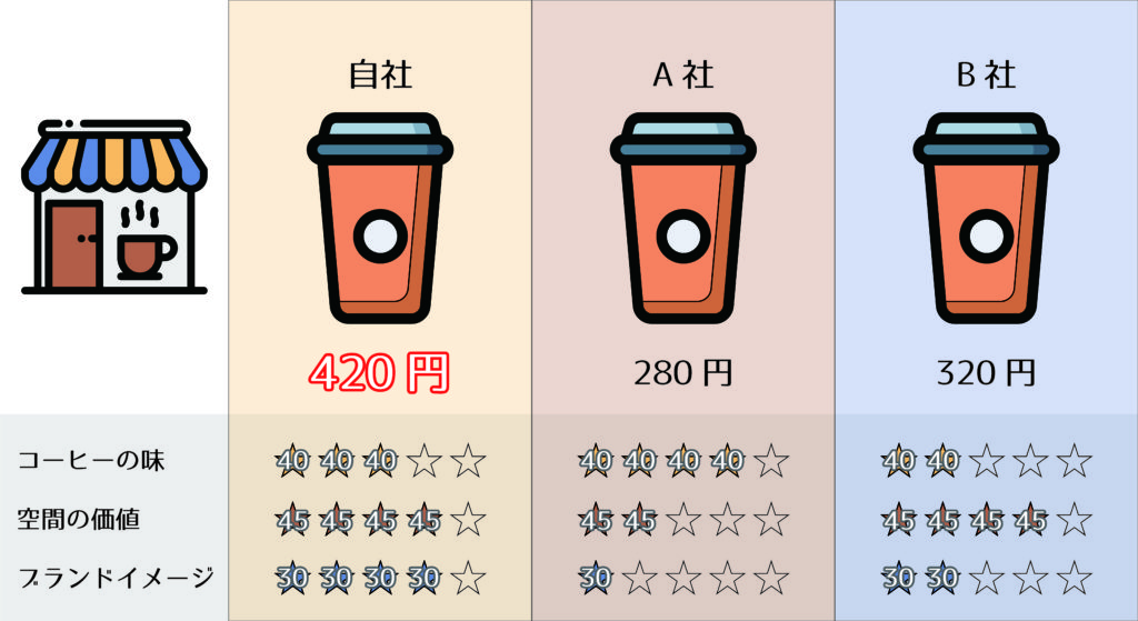 自社のコーヒーの値段は40 x 3 + 45 x 4 + 30 x 4 = 420円と競合と比較すると少しハイエンドな売り出し方をするのが妥当と言えそうです。