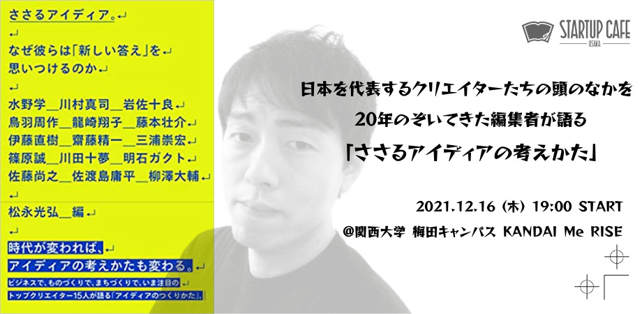 このイベントでは、ビジネスで、ものづくりで、まちづくりで注目の15人のクリエイターや事業家たちにインタビューし、まさにそのテーマを追求した書籍『ささるアイディア。なぜ彼らは「新しい答え」を思いつけるのか』の発刊を記念して、編著者である編集家の松永光弘さんに、「いまこの時代に必要なアイディアの考えかた」について、ポイントをおさえながら総括的にお話しいただきます。