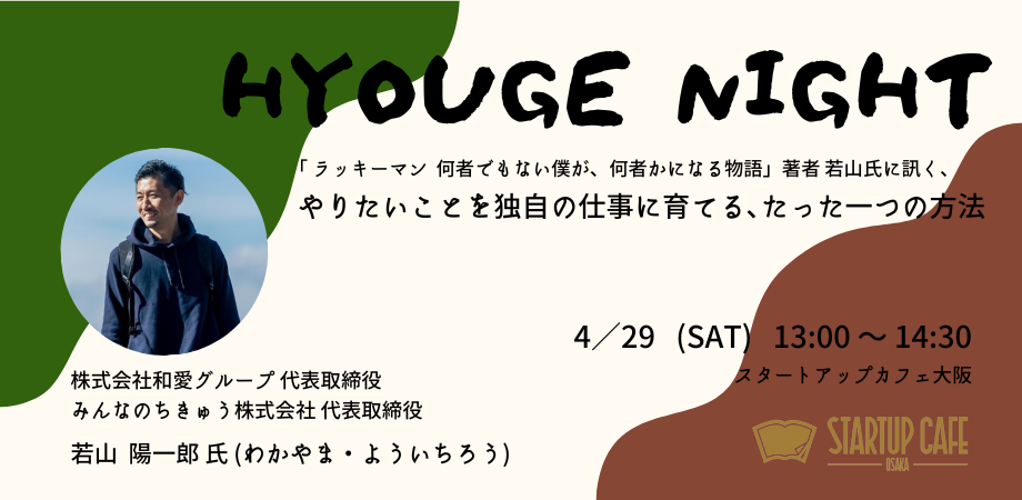 今回の「HYOUGE NIGHT(ひょうげないと)」ゲストは、「ラッキーマン 何者でもない僕が、何者かになる物語」の著者であり、起業家の若山 陽一郎 氏をお迎えします。