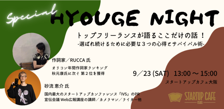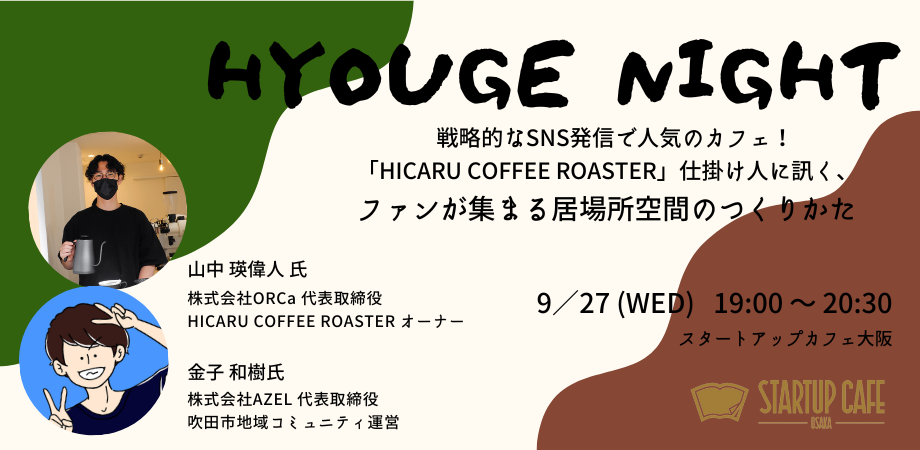 今回の「HYOUGE NIGHT(ひょうげないと)」ゲストは、起業と言えば、誰もが一度は憧れを持つ人気カフェ!そんな人気カフェのオーナーとしてご活躍されている山中瑛偉人さんと、企画の立ち上げから運営に関わり、自身も起業家の金子和樹さんをお迎えします。