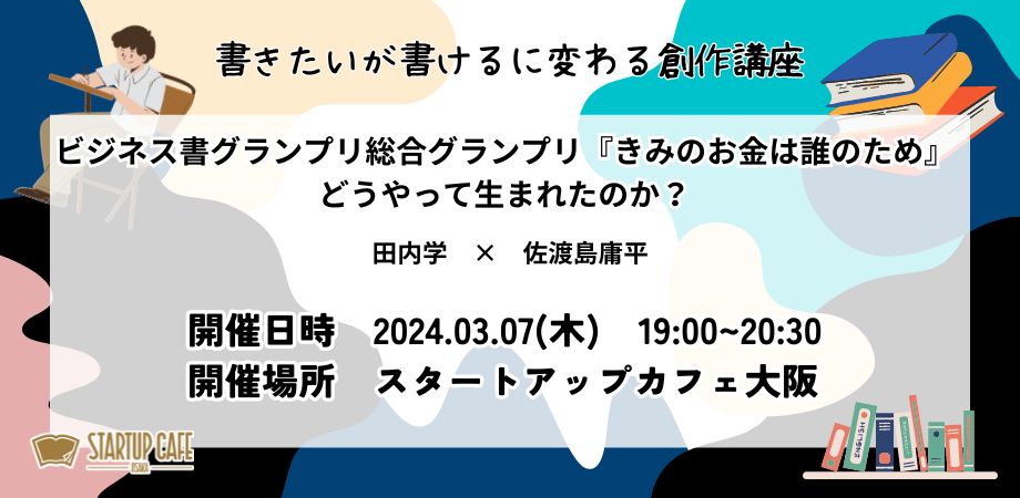 2016年から約5000名以上の起業相談を受け、支援してきたスタートアップカフェ大阪が企画、運営する、書店をゲームのように楽しむ場所にするプロジェクトです。本講座「書きたいが書けるに変わる創作講座」は書店ゲームの一環です。ぜひご注目ください。