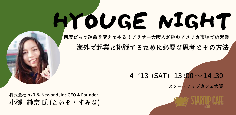 今回の「HYOUGE NIGHT(ひょうげないと)」ゲストは、スタートアップカフェ大阪の元コーディネーターでもあり、彼女自身も起業家として国内外を飛び回る、株式会社inxR & Newond, Inc CEO & Founder 小磯純奈 氏をお迎えします。