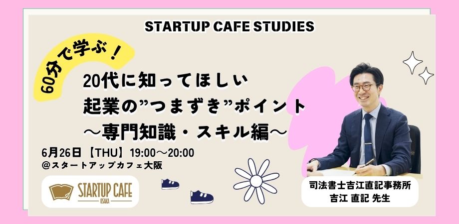 今回は、スタートアップカフェ大阪の士業相談でお馴染み、司法書士の吉江直記先生をお招きし、<60分で学ぶ 20代に知ってほしい起業の”つまずき”ポイント~専門知識・スキル編~>をお話いただきます。