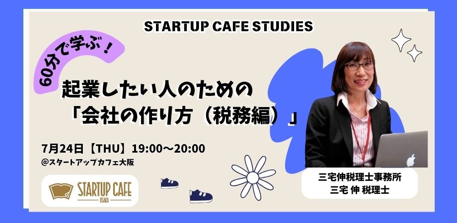 今回は、スタートアップカフェ大阪の士業相談でお馴染み、税理士の三宅伸先生をお招きし、<60分で学ぶ 会社の作り方・税務編>をお話いただきます。