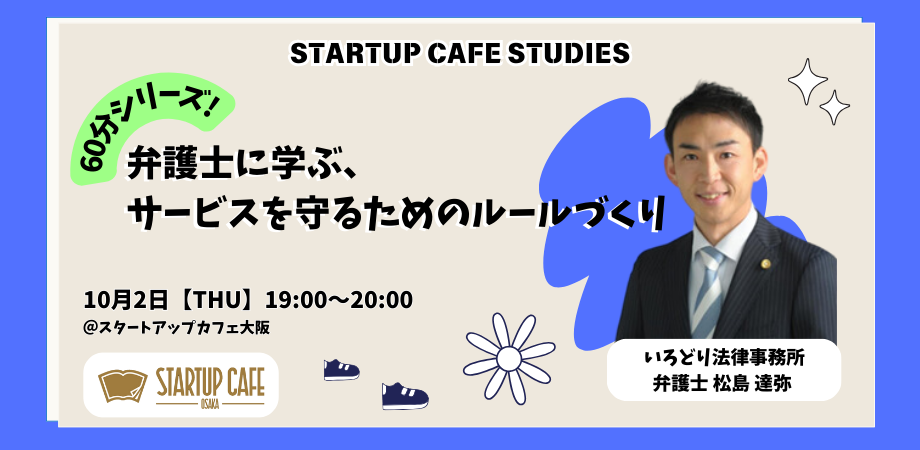 今回は、スタートアップカフェ大阪の士業相談でお馴染み、弁護士の松島達弥先生をお招きし、<起業準備に必須の“利用規約”>についてお話いただきます。