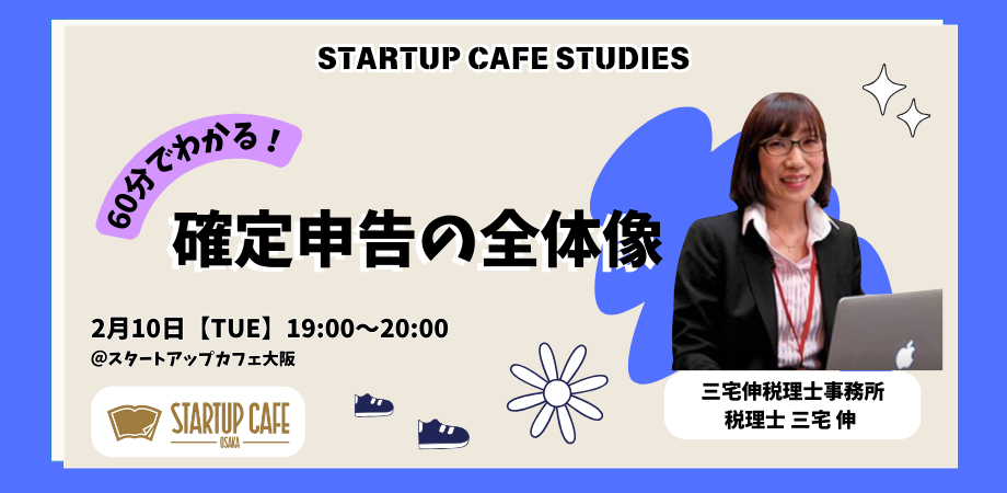 今回は、スタートアップカフェ大阪の士業相談でお馴染み、税理士の三宅伸先生をお招きし、<確定申告の全体像>をお話いただきます。