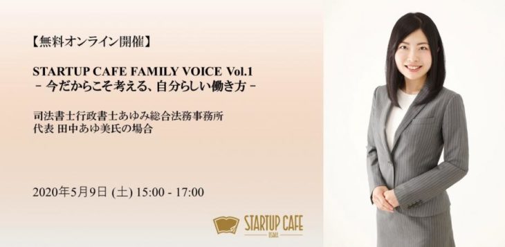 【終了】【無料オンライン開催】STARTUP CAFE FAMILY VOICE Vol.1 - 今だからこそ考える、自分らしい働き方 - 司法書士行政書士あゆみ総合法務事務所代表 田中あゆ美氏の場合